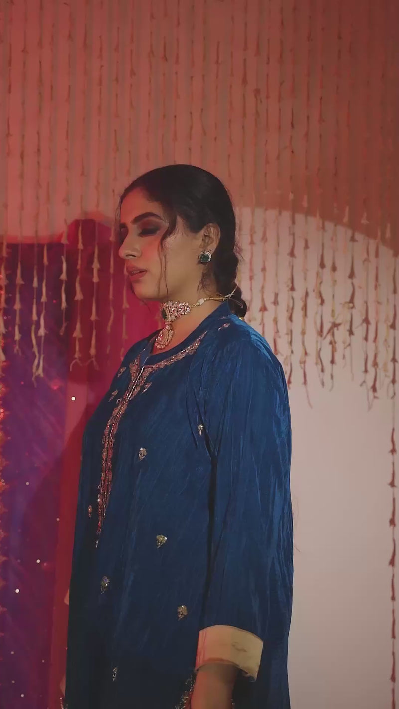 Wrapped in regal hues of Royal blue & Rani pink, this exquisite ensemble is crafted from pure crinkled velvet. The kurta features intricate dabka & sequins embroidery, complemented by front slit. Paired with rich brocade pants, it exudes sophistication & style. Embroidered flower motifs & a distinctive silhouette makes this timeless piece truly stand out.