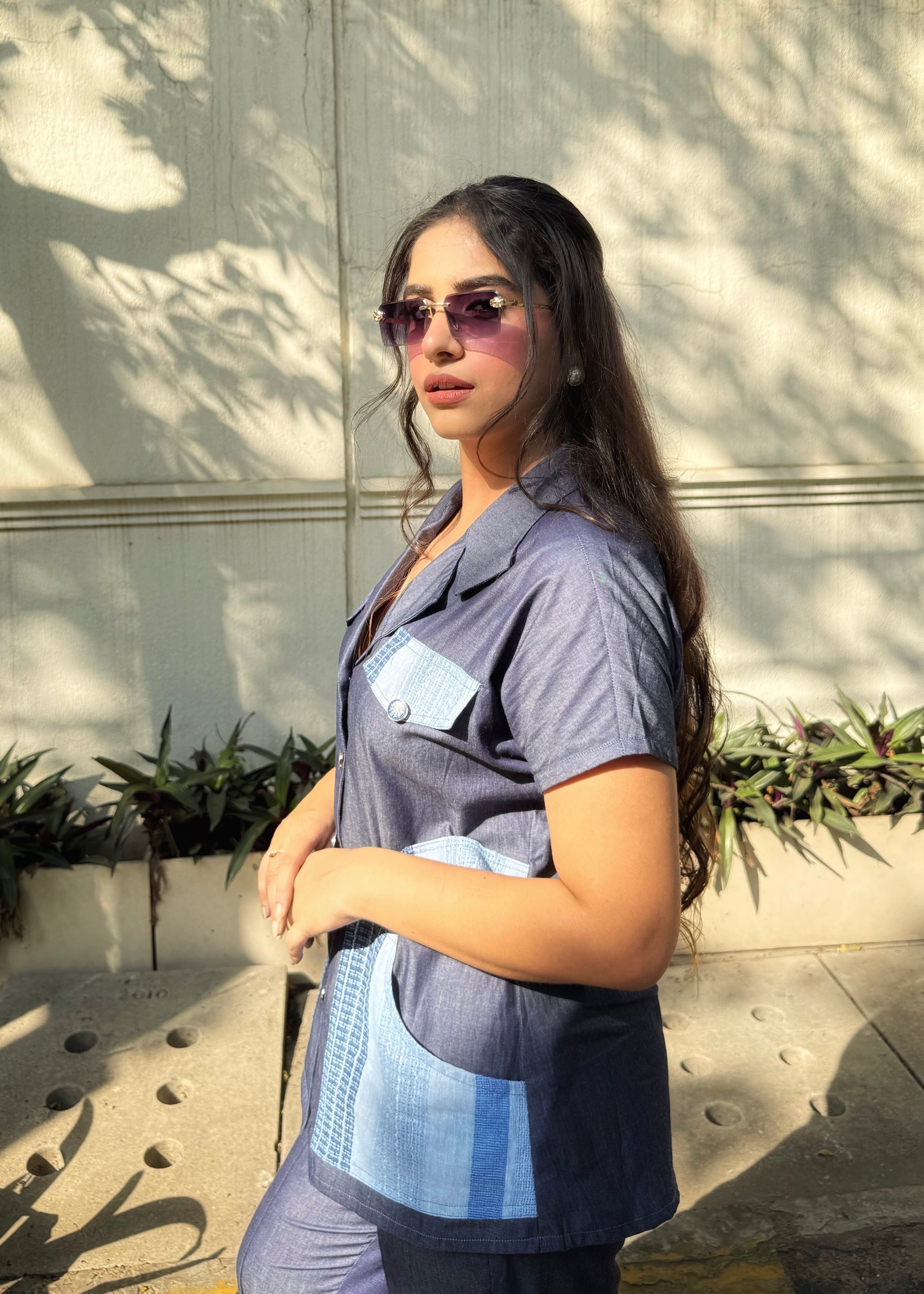 A statement short-sleeved denim blazer, elevated with contrast patchwork panels in lighter hues. Featuring structured lapels, front flap utility-style pockets, and a button-down front, this versatile piece brings structure to your spontaneity. A perfect mix of edgy and casual.