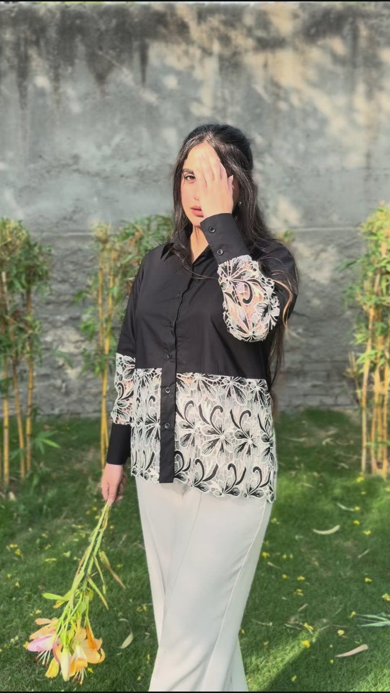 Redefine everyday elegance with our Midnight Bloom Cutwork Shirt - a statement black cotton shirt for women, featuring intricate floral cutwork along the hem and sleeves, finished with delicate pearl accents.