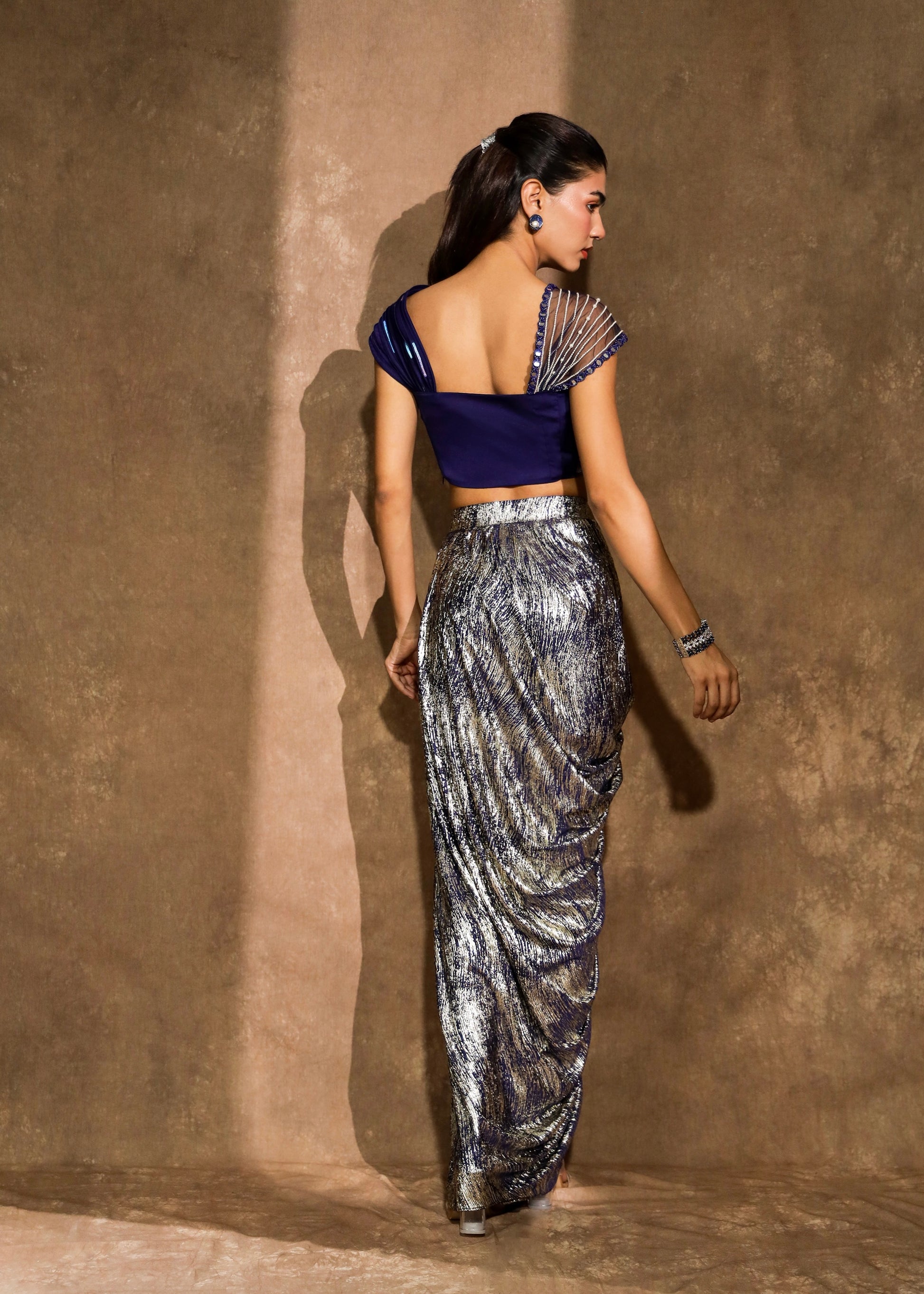A midnight sapphire blue pre-stitched metallic drape skirt with a front slit, paired with a hand-embroidered silk crepe blouse featuring a cross-draped neckline and sculpted 3D draped shoulders. Embellished with sequins, pearls, and mirror accents, this two-piece set captures a modern shimmer which is perfect for festive evenings, cocktails, and destination weddings.
