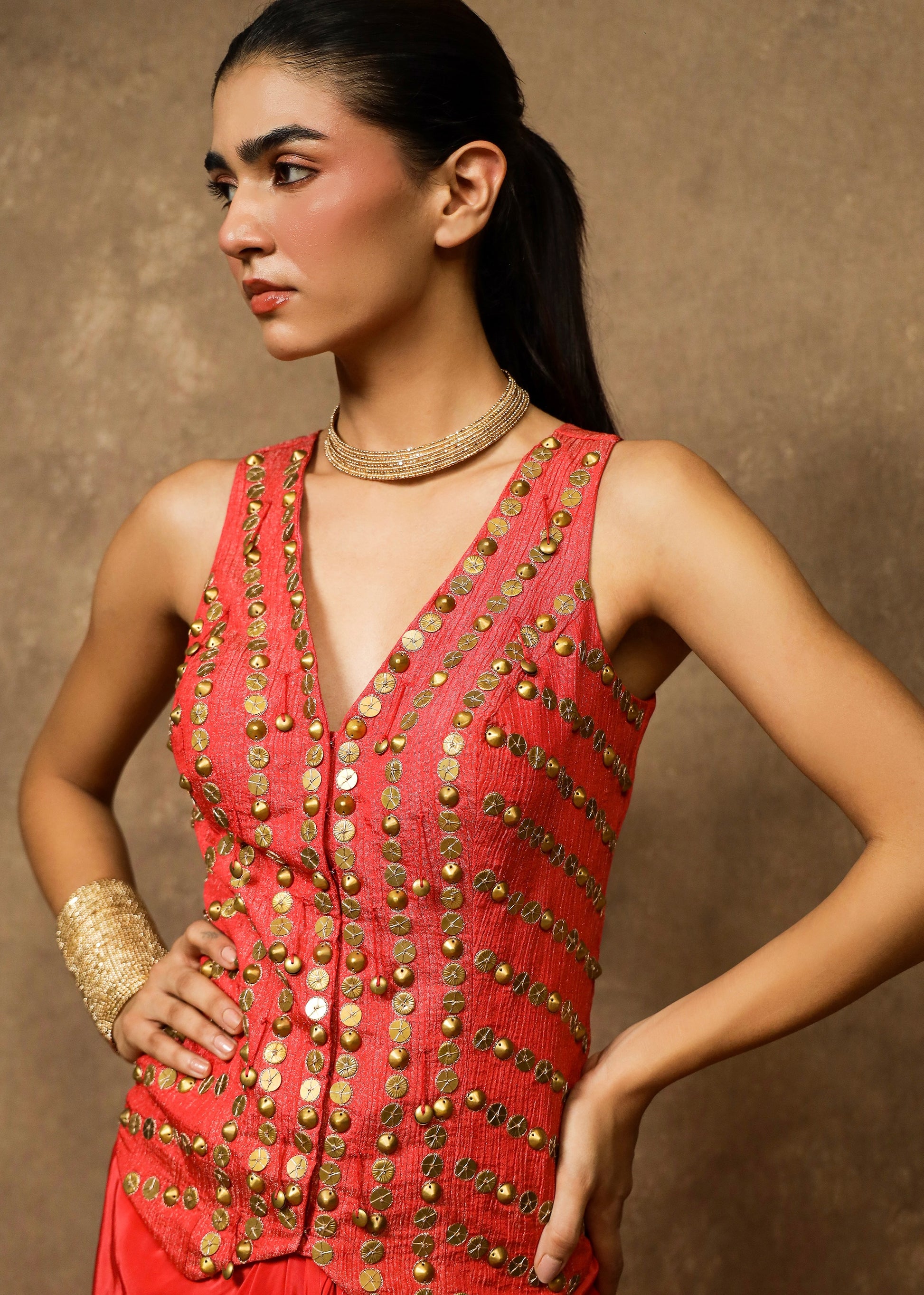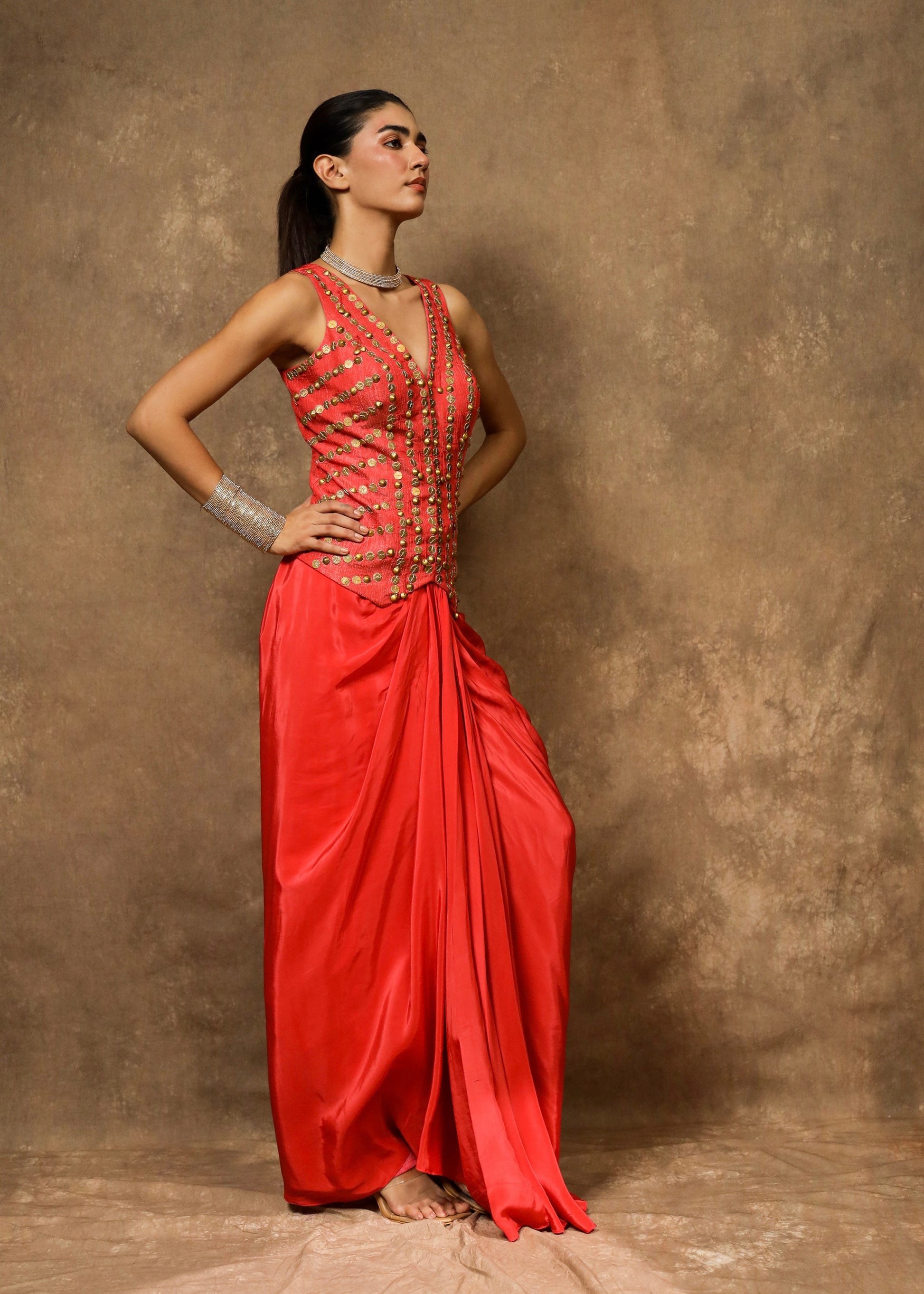 A rust pre-stitched crepe drape skirt paired with a crinkled tissue V-neck waistcoat, intricately hand-embroidered with metallic gold embellishments. Finished with striking hanging coins and a statement lace-up back, this modern two-piece set blends effortless draping with bold, contemporary embroidery for your next festive or wedding guest look.