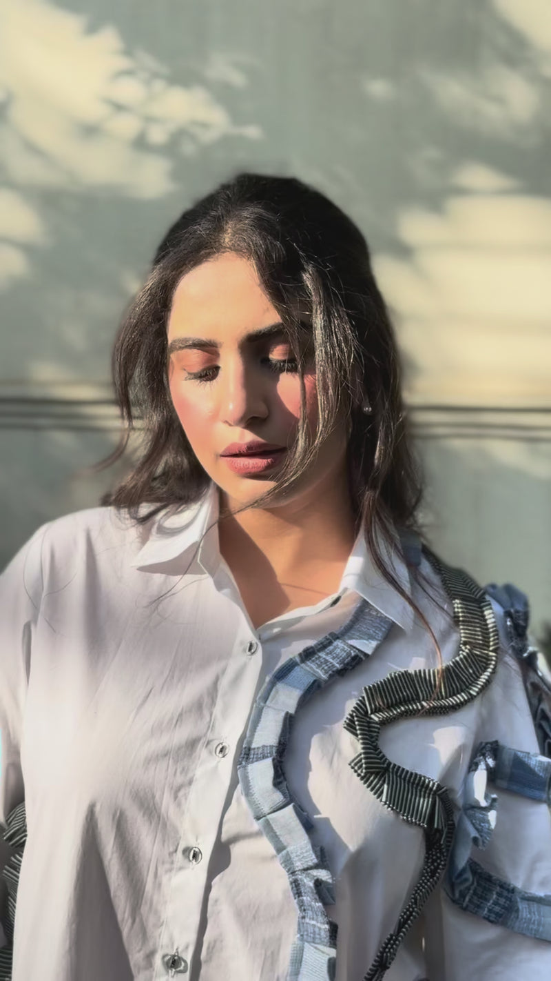 Elevate your everyday look with the Triocinno Denim Waves Shirt - a unique fusion of clean tailoring and playful artistry designed for the bold minimalist. This white cotton shirt features dynamic, asymmetrical ruffles made of contrasting denim that sweep across the torso and sleeves like fluid waves. Designed to stand out, the shirt combines structure and softness, making it ideal for statement dressing in both casual and semi-formal outings. Crafted in breathable cotton with durable denim detailing, its comfort meeting creativity.